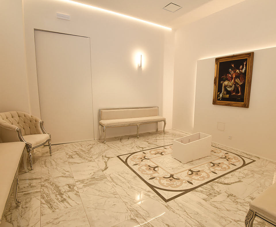 Abbiamo a disposizione 6 sale, tutte divise in due ambienti: la camera ardente ed un salottino privato. Le sale sono dunque luoghi tranquilli e confortevoli, al loro interno i familiari possono raccogliersi nella massima privacy e ricevere la visita e il conforto di parenti, amici e conoscenti in uno spazio protetto e riservato.